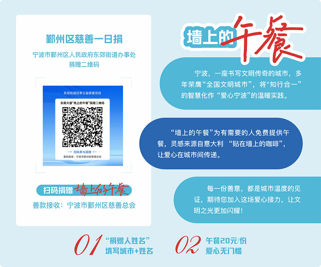 鄞州区慈善总会升级东南大厦“墙上的午餐”专用捐赠二维码,更新如下: